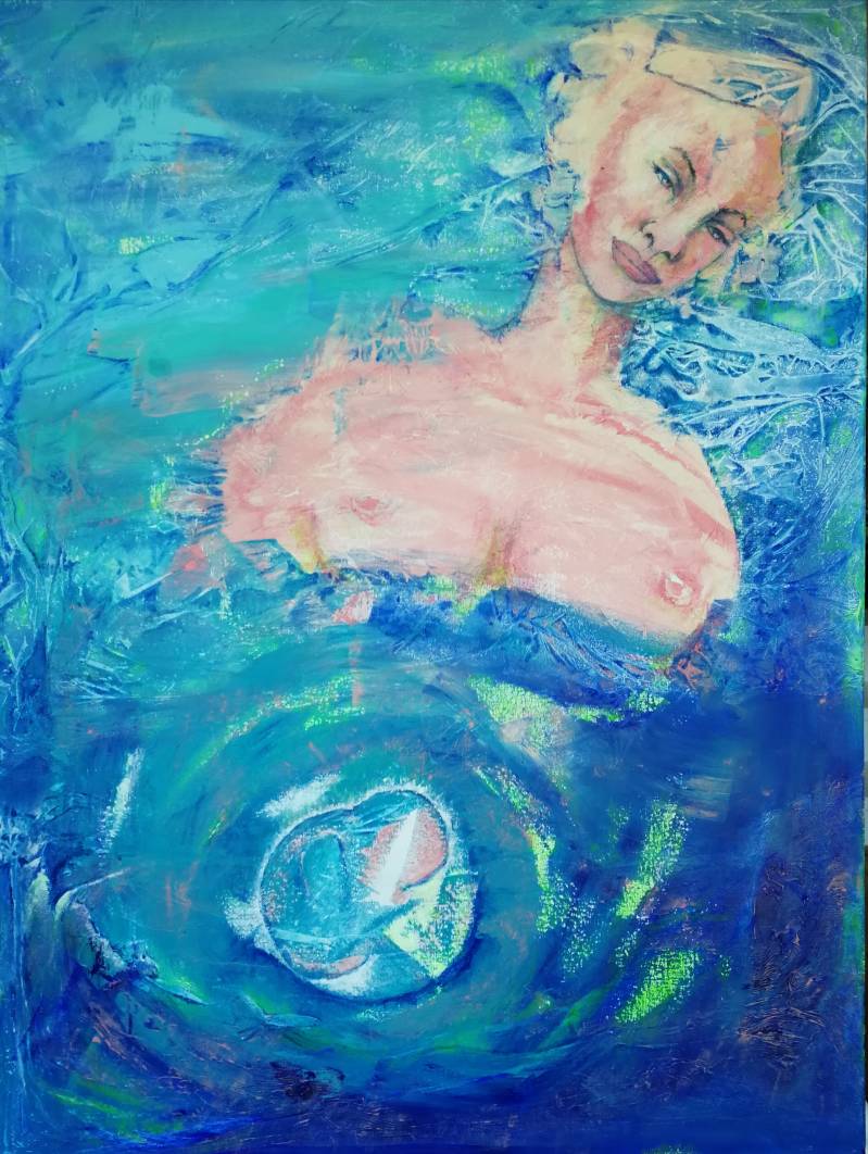 Werkwijze: Voor deze schilderijen heb ik mij laten inspireren door thematieken van de dierenriem, zonder op traditionele wijze de dierenriemtekens te willen verbeelden. Ik ben steeds op dezelfde wijze te werk gegaan. De achtergrond is op een organische manier ontstaan door het doek te bestrijken met een dunne of iets dikkere laag acrylverf. Daarop heb ik huishoudplastic gelegd en laten drogen, waardoor structuren ontstonden. Deze heb ik deels weer gebruikt als toevallige elementen in het werk. Vervolgens zocht ik afbeeldingen via internet die ik op een eigen wijze verwerkte binnen de ontstane structuren. Abstract en figuratief komen hier samen.