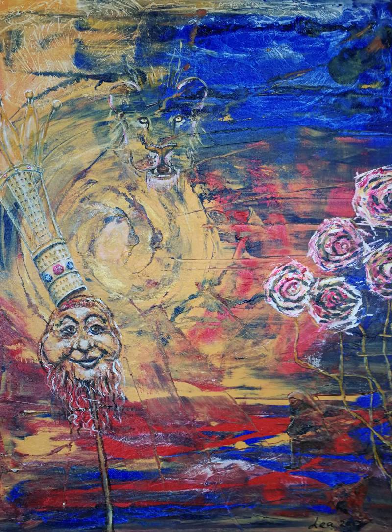 Hoe beter we weten waar we vandaan komen en wat ons vormde, hoe sterker we ons bewust worden van ons 'ik'. Het ik ofwel het ego kan de koning van ons leven worden. In het schilderij zien we links een masker van kabouterkoning. Zijn kroon wankelt. Wat stelt hij echt voor? De Leeuwenkop staat voor ongepolijste oerkracht. De roos als bloem van de Leeuw staat voor de liefde, die nodig is om oerkracht te temmen en kanaliseren.
